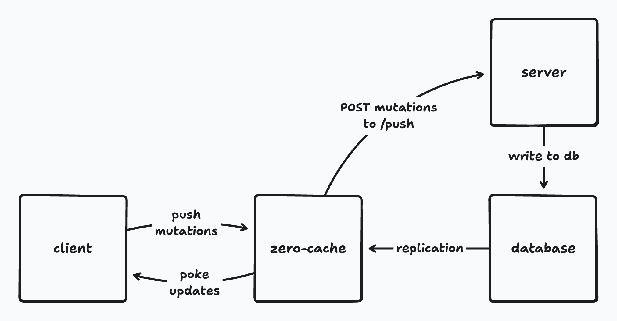 In the background, Zero sends a mutation (a record of the mutator having run with certain arguments) to your server's push endpoint. Your push endpoint runs the push protocol, executing the server-side mutator in a transaction against your database and recording the fact that the mutation ran. The @rocicorp/zero package contains utilities to make it easy to implement this endpoint in TypeScript.